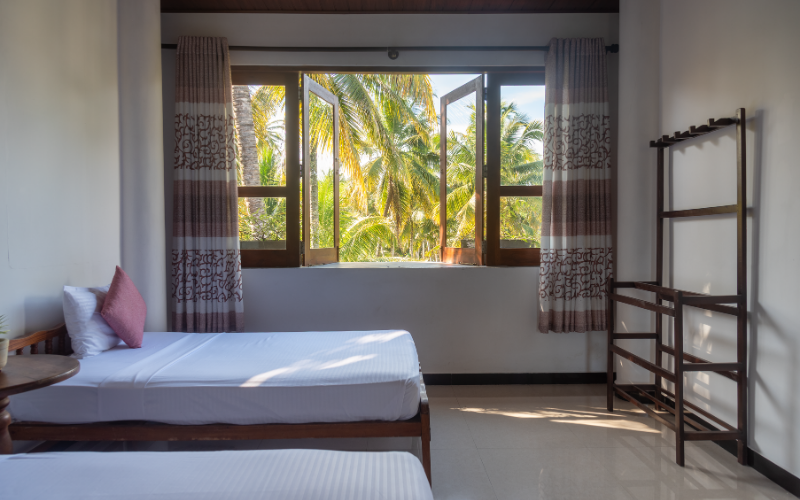 Perfect for friends or small groups, this room features three single beds and a large open-air private bathroom, giving you space to unwind after a day in the surf.